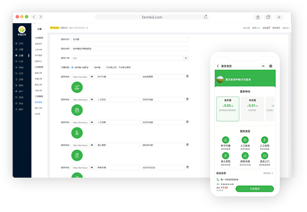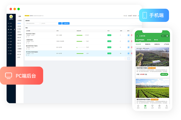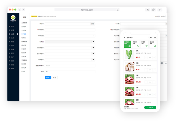 后台增加种子,上传种子图并填写种子价格、种植面积、播种季节、种子详情、产量生长周期和采摘周期;为空闲地块选择种子下单支付,农场为土地进行种植,后台可为已种植的种子设置状态。