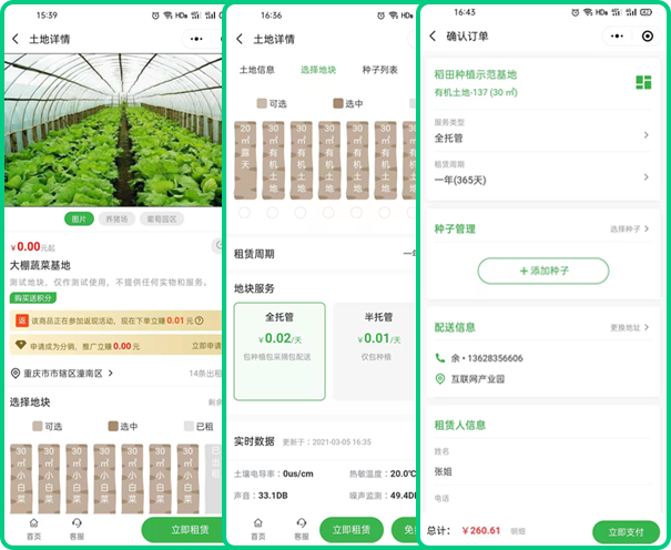 添加地块选择种植的种子和配送信息,填写租赁人相关信息,立即支付
