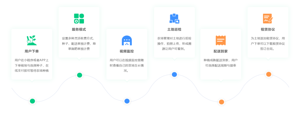 用户租赁农场土地,委托农场托管或自己种植想吃蔬菜,通过农场安装视频监控,物联设备为客户提供远程监控服务,种植成熟配送到家,定制蔬菜种植新模式,现实版开心农场。